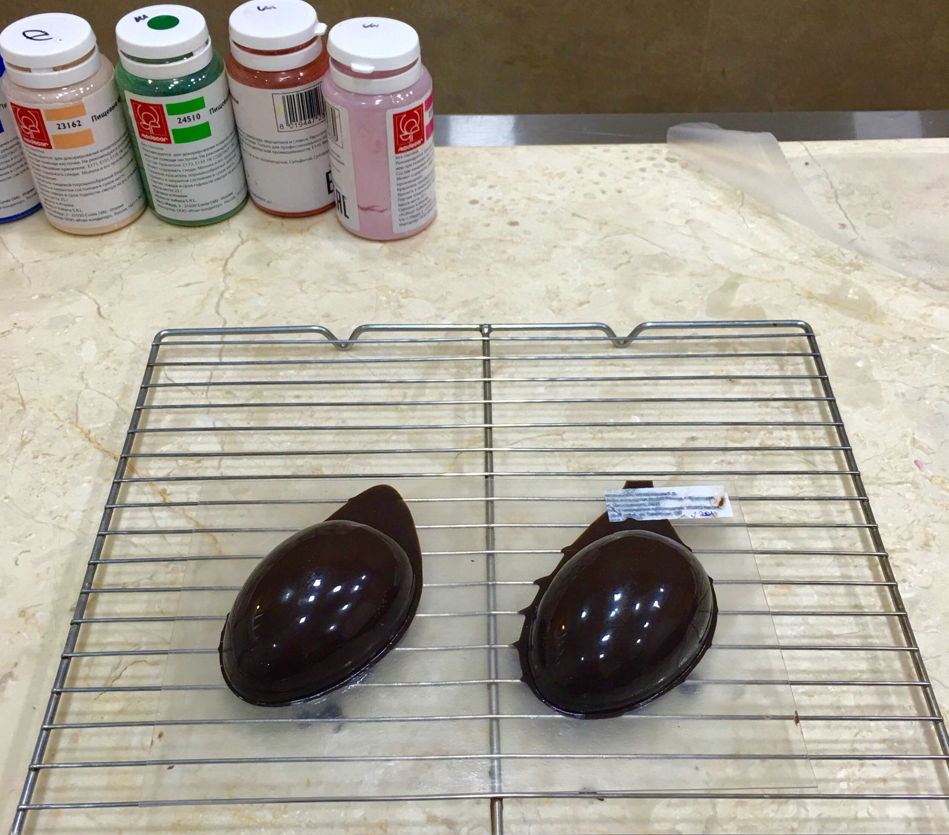 Наливаем темперированный шоколад или глазурь в форму, переворачиваем, чтобы слить лишнее. Повторяем так несколько раз. Можно после каждого заполнения формы убирать её на 3–4 мин в холодильник. Таким образом, получаем стенку яйца нужной толщины. После окончательного заполнения формы, даем ей стечь, поставив на решетку.