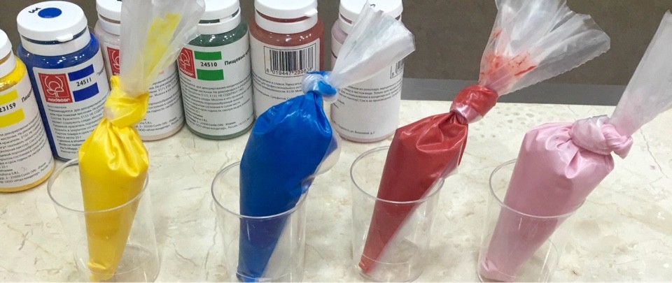 Подкрашиваем белую глазурь сухими жирорастворимыми красителями. Посмотрите, какие насыщенные цвета получаются при использовании красителей «Modecor» с небольшими дозировками.