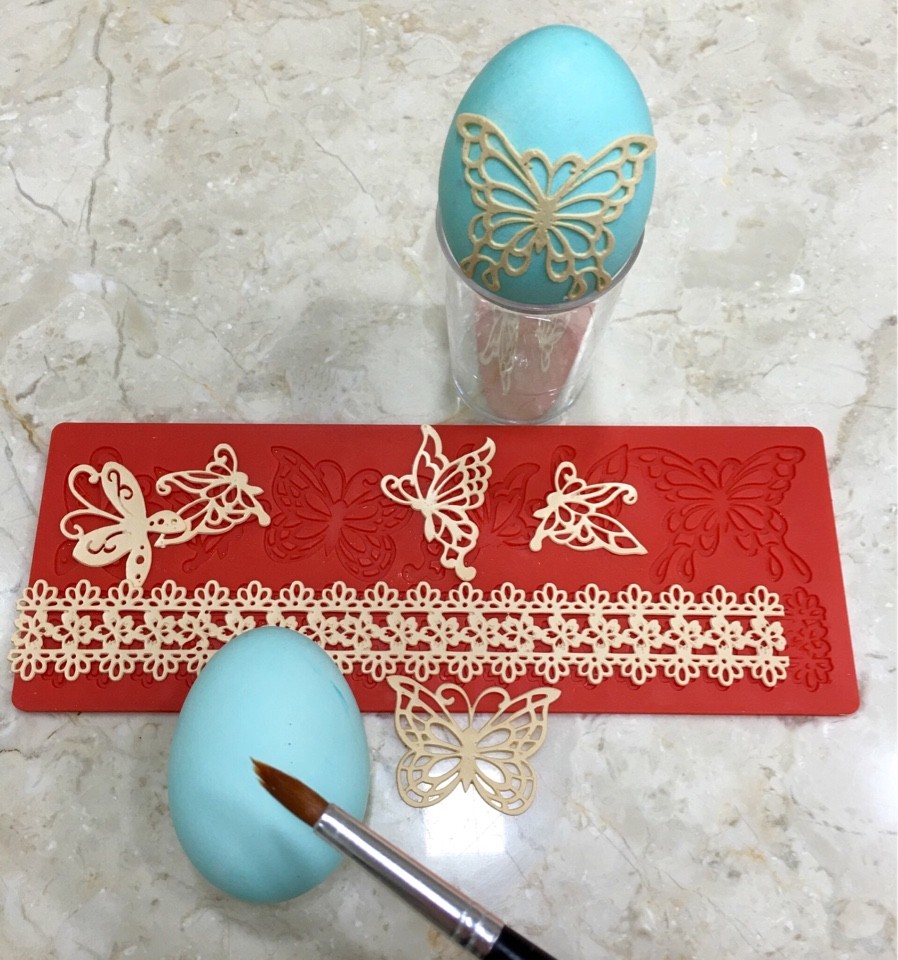 Кисточкой смачиваем поверхность яйца. Не волнуйтесь, краска не смоется! И приклеиваем бабочку или любой другой элемент кружева при помощи пищевого клея (арт. 24198/Р). Аккуратно прижимаем. Теперь наша бабочка надежно сидит на месте.