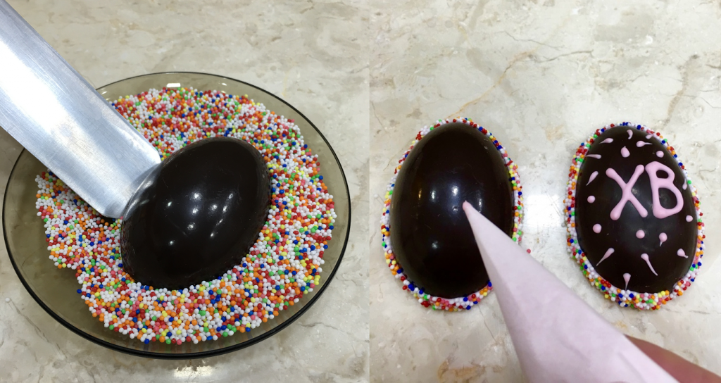 Ах да, совсем забыли — это же пасхальное яйцо! Давайте декорировать. Наносим немного растопленной глазури из корнетика и посыпаем кондитерской посыпкой. И, наконец, — пасхальная надпись!