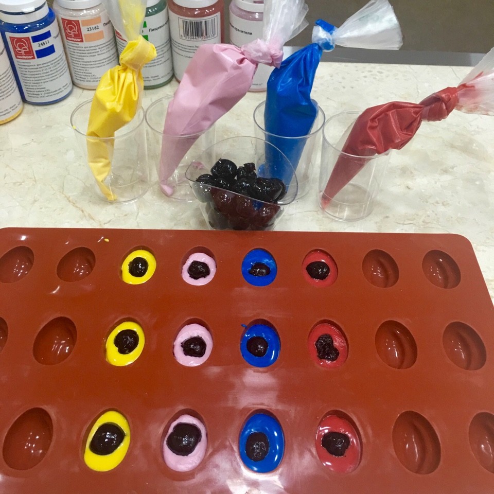 Завершая тему пасхальных яиц, сделаем небольшие, как конфетки, разноцветные шоколадные яйца с начинкой из полузасахаренной вишни — «Амарена» (арт. LCA 606054050).