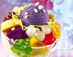 А это национальный филиппинский десерт - "Хало-Хало". В стаканчик для десерта укладываются нарезанные кусочки фруктов, желе, смешанные с мелко колотым льдом. Сверху шарик мороженого, взбитые сливки, коктейльная вишня и т. д. И все это заливается сладким кокосовым молоком, посыпается хрустящими хлопьями, измельченными орешками. Вот такое необычное мороженое. Честно говоря, попробовав его в первый раз, он показался мне очень специфическим. Подается этот десерт как порционно, так и на большую компанию. В кафе острова Боракай я наблюдала компанию японцев, увлеченно поглощающих десерт из одной емкости величиной с небольшой тазик.