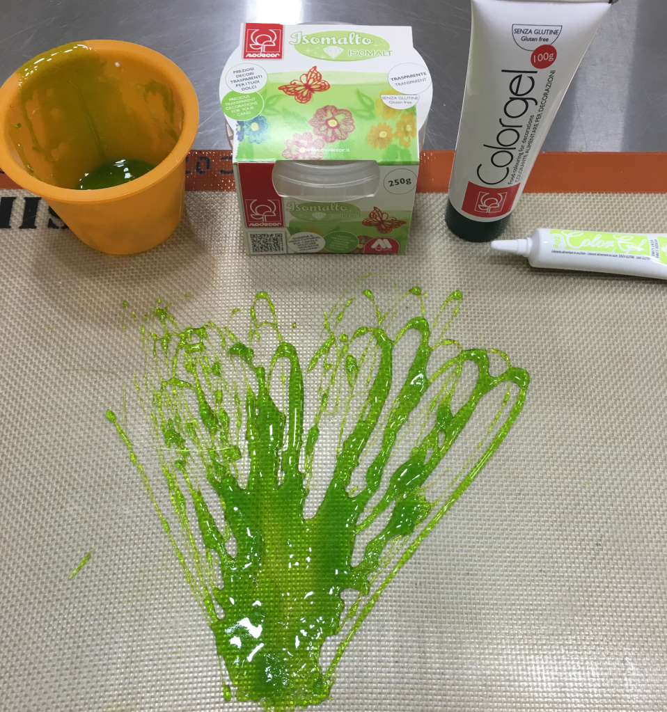 Обязательно убедимся, что она выдерживает высокие температуры! И только после этого ставим в микроволновку. Разогреваем, периодически помешивая железной или деревянной ложкой (только не пластиковой, так как температура растопленного изомальта выше 150 С°). Обязательно наденьте перчатки! Порошкообразный изомальт растопился, стал текучим и прозрачным, добавляем небольшое количество красителя – «Лаймовый» (арт. 24164/p) и «Темно-Зеленый» (арт. 23128/p), перемешиваем – наши будущие водоросли будут изумрудно-зеленого цвета.