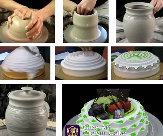 Возможно, вы назовете еще несколько техник наподобие этих. А слышали ли вы что-нибудь про технику CLAY ART CAKE или «Глиняные торты»? Торты по такой технике собираются при постоянном вращении столика-подставки. Уникальная форма придается им с помощью ровного шпателя и еще нескольких несложных инструментов. Такой метод сборки напоминает процесс создания глиняного изделия на гончарном круге. И эта магия превращения кусочка глины в прекрасную вазу – или небольшого тортика с бесформенной массой сливок в удивительный шедевр кондитерского искусства – поистине завораживает.