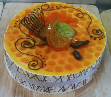 В завершение - украшаем торт. В нашем случае, я использовала бордюрную ленту Modecor, листы с переводным рисунком для шоколада и засахаренную дольку апельсина.