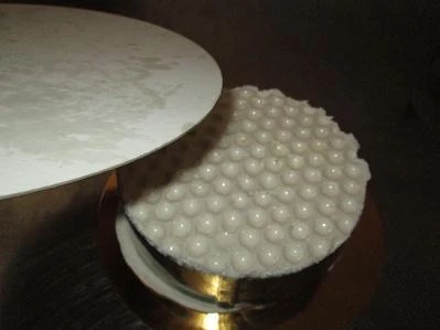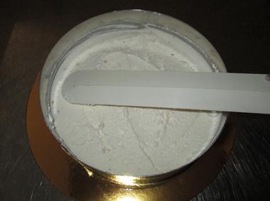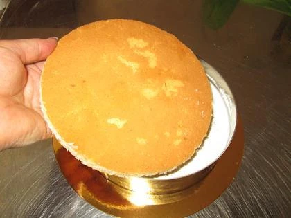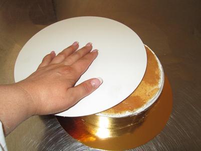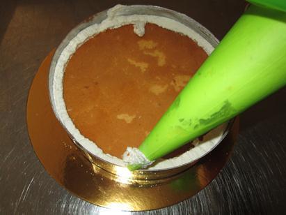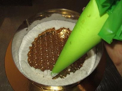 Далее, поместив бандаж (также смазанный растительным маслом) на золотую подложку и положив на дно вырезанный круг, так, чтобы выпуклая сторона оказалась сверху, я начала сборку торта. Заранее подготовленный крем я выложила в кондитерский мешок и заполнила низ формы.