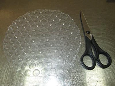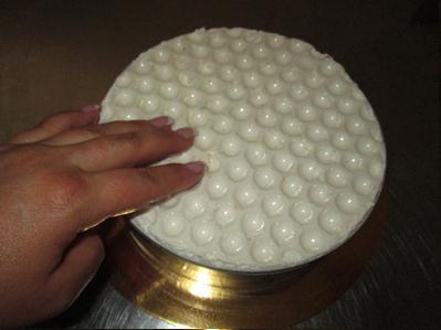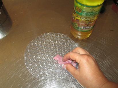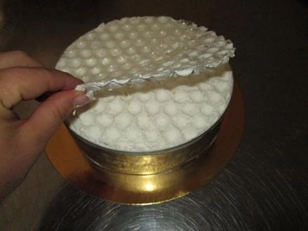 Потом я его перевернула и убрала нижнюю подложку. Сверху заготовки окажется рельефный лист. Теперь изделие необходимо убрать на 30-40 минут в холодильник или морозильную камеру.