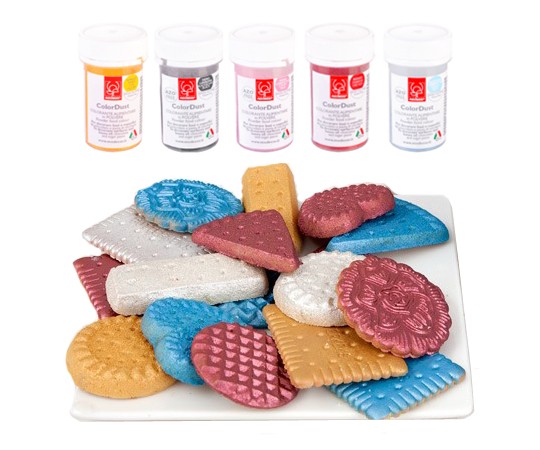 - сухое напыление: используется для окраски шоколадных фигурок, цветов из мастики, засахаренных фруктов и выпечки. Краситель в сухом виде наносится кисточкой непосредственно на поверхность изделия.
