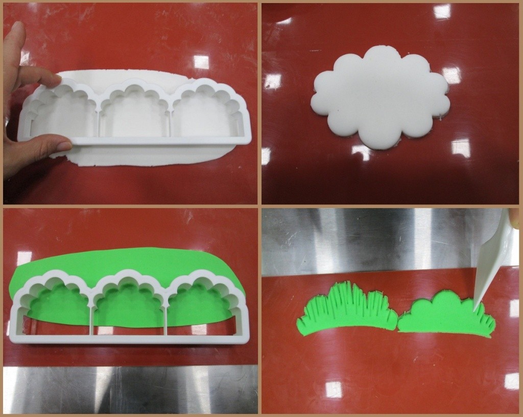 Шаг 7. Украсим нашу полянку цветами. Воспользуемся специальным плунжером для маленьких цветочков и разместим их на торте.
