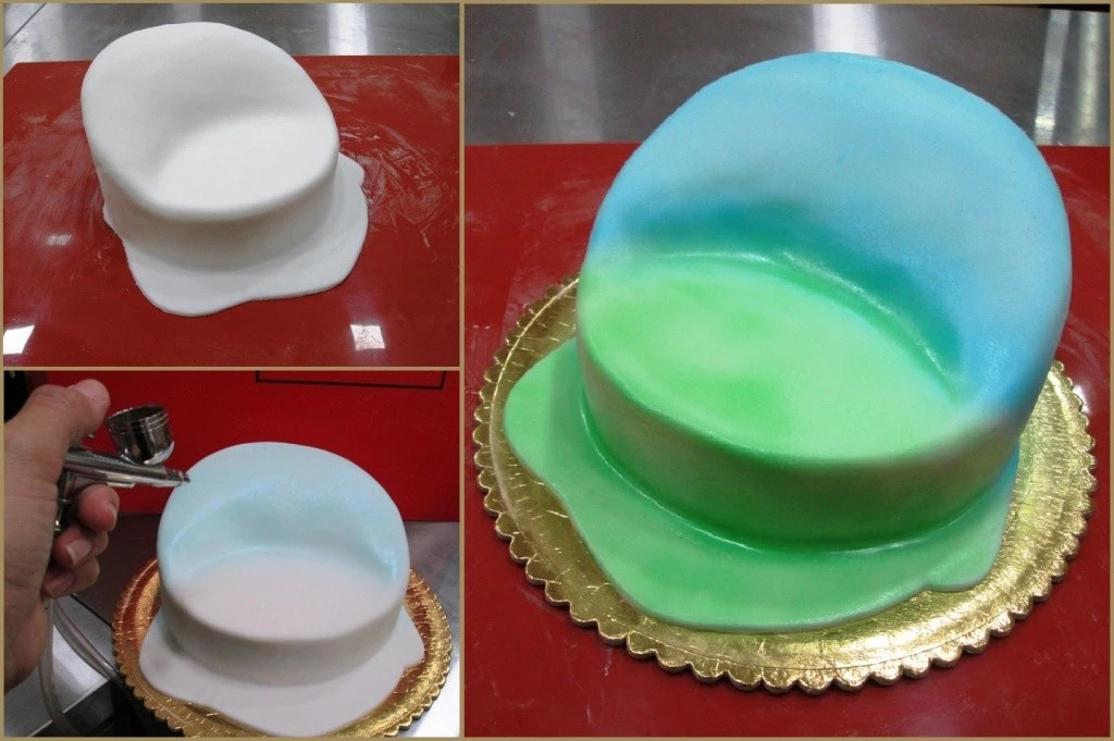 Шаг 3. При помощи аэрографа наносим фон на заготовку – в нашем случае возвышенность красим в голубой цвет (небо), а основание в зеленый (полянка). Если у Вас под рукой нет аэрографа, Вы можете раскрасить изделие обычной хозяйственной губкой, просто смочив ее в разведенном красителе и аккуратно нанеся цвета.