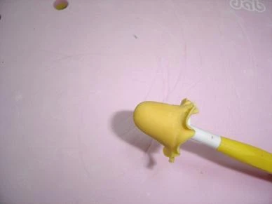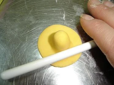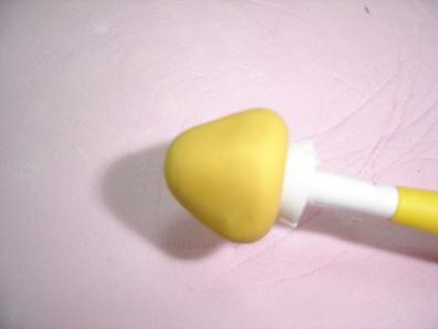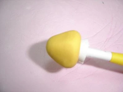 Далее подготавливаем сердцевину цветка. Для этого, подкрашиваем мастику в желтый цвет при помощи гелевого красителя. Затем раскатываем шарик и насаживаем его на конусообразную палочку из набора «Marset». После этого формуем конус и раскатываем его края на столе.