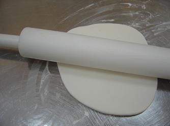 При помощи кондитерской насадки обрезаем края, укладываем получившуюся заготовку на мягкую доску для работы с мастикой и создаем волнистые края.