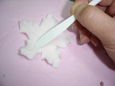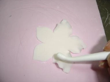 Далее укладываем фигурку на мягкий коврик для работы с мастикой и с помощью инструмента из набора «Marset» слегка вытягиваем лепестки цветка по направлению от центра, после чего проводим вдоль края лепестка другим инструментом из того же набора, делая его волнистым.