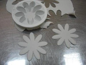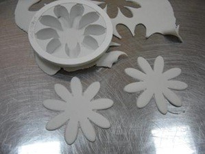 • Начнем с традиционного раскатывания мастики слоем толщиной 1,5-2мм, после чего вырезаем при помощи специальной вырубки два цветка.