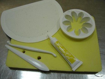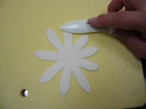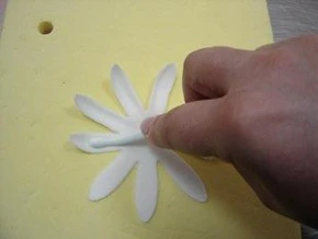 • Затем выкладываем их на мягкую доску для работы с мастикой, и при помощи специального инструмента из набора MARSET слегка вытягиваем лепестки цветка по направлению от центра, а потом другим инструментом из того же набора проводим вдоль лепестка по направлению к центру.