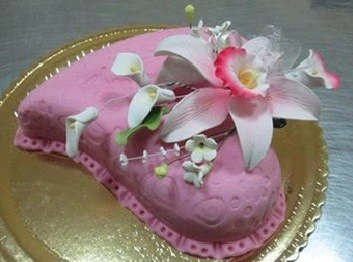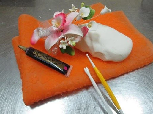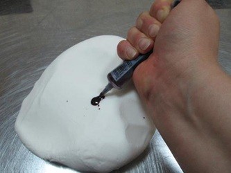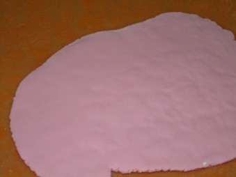 Шаг 1. Вначале окрашиваем мастику при помощи уже известного нам розового гелевого красителя Modecor и раскатываем ее слоем не менее 3-4мм.