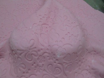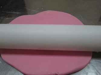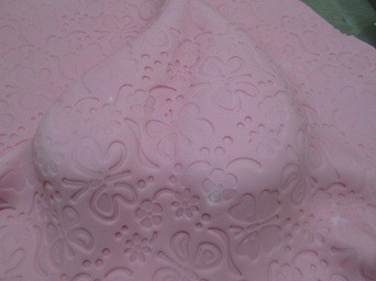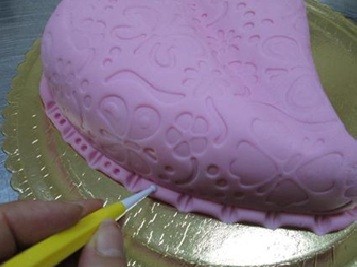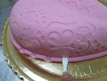 Шаг 3. Разглаживаем мастику, аккуратно расправляя складки и стараясь не испортить рисунок. Лишнее обрезаем при помощи пластикового ножа из набора «Marset». Из кусочка розовой мастики катаем жгут.