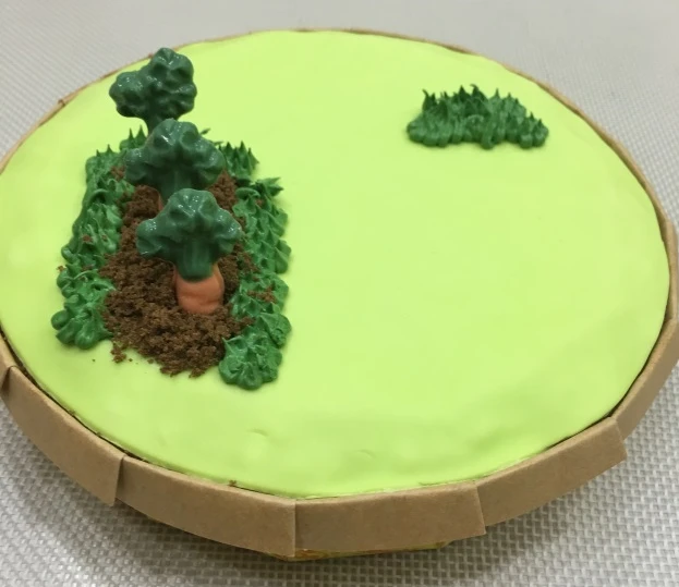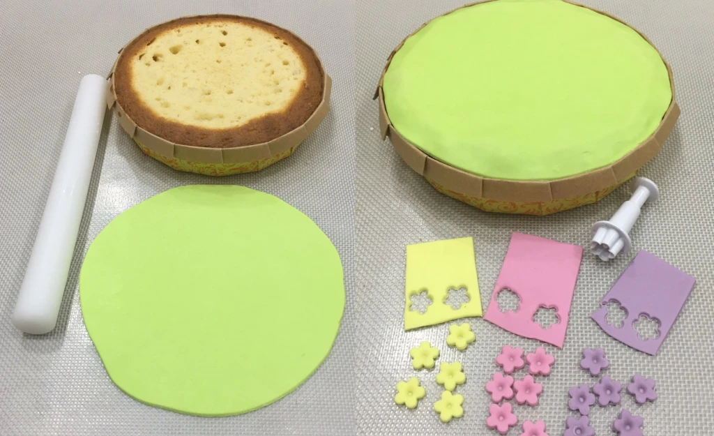 Раскатываем зеленую мастику, вырезаем по диаметру, подходящему нашему пирогу. Затем вырубаем цветочки из мастики фиолетового, розового и желтого цвета.
