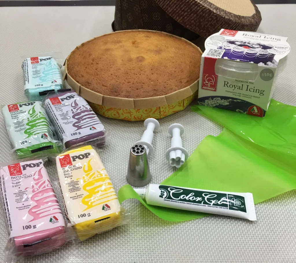 Для пирогов у нас есть широкий ассортимент форм — силиконовых и бумажных. Вот в одной из них мы и будем выпекать. На ваш выбор добавьте любую вкусную начинку. Для декора будем использовать цветную мастику «POP mini» от «Modecor» (в удобных упаковках по 100гр.), немного гелевого красителя «Темно-зеленый» (арт. 24139/p), новую насадку в виде травки «8 отверстий» (арт. BX 1713/p), смесь для создания айсинга — «Royal Icing» (арт. 22688/p), и набор вырубок c выталкивателем — «Цветок» (арт. 40-W015).