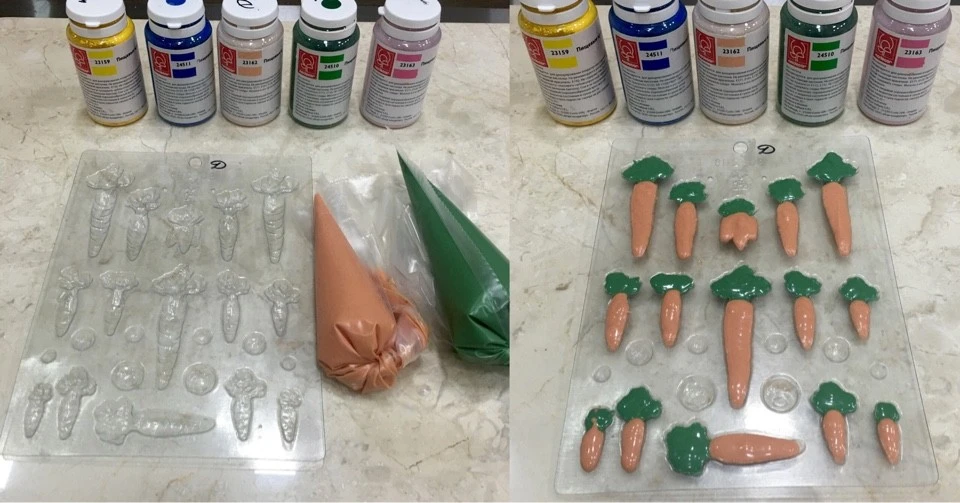Для изготовления морковки берем пластиковую форму и заполняем её темперированным шоколадом или шоколадной глазурью, предварительно подкрасив сухими красителями «Modecor». Убираем на 15-20 минут в холодильник, затем легко извлекаем из формы.