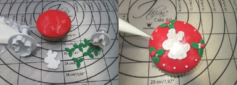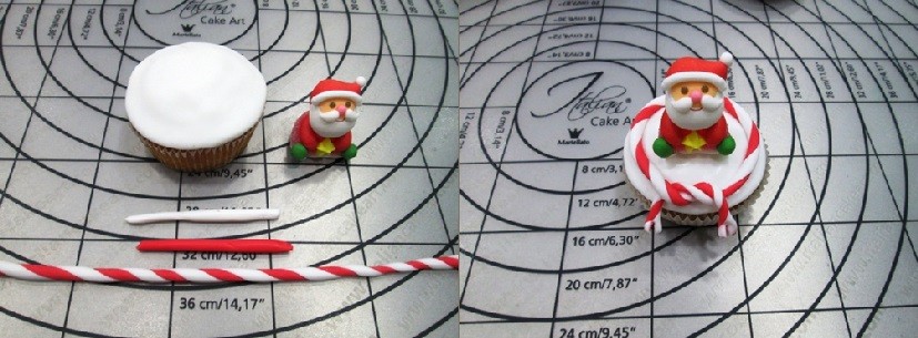 Шаг 7. Для придания капкейкам праздничного вида я буду использовать готовые сахарные и мармеладные фигурки из новогодней коллекции Modecor. В центр с помощью айсинга крепим фигурку, затем катаем два жгутика из белой и красной мастики диаметром 2-3мм., после чего соединяем и перекручиваем жгут. Поверхность капкейка смачиваем водой и укладываем жгут по окружности. Далее завязываем узелок и обрезаем лишнее.
