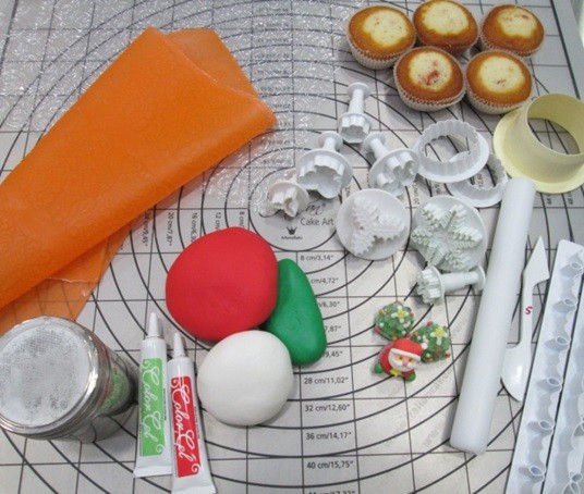 Шаг 3. Предварительно окрашиваем мастику с помощью гелевых красителей (я решила использовать три самых любимых новогодних цвета: красный, зеленый и белый), раскатываем толщиной 2-3мм. и вырезаем круг по диаметру поверхности кекса. Если Вы используете рельефные коврики, то нужно предварительно раскатать мастику на ровной поверхности, аккуратно прокатать на рифлёном коврике и затем вырезать круг.