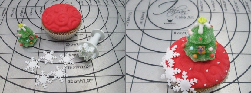 Шаг 8. Красный капкейк с рельефным покрытием декорируем белыми снежинками, которые мы изготовили с помощью вырубки “Снежинка” (артикул 40-W010) и мармеладной ёлочкой. Дополнительно декорируем айсингом в виде точек.