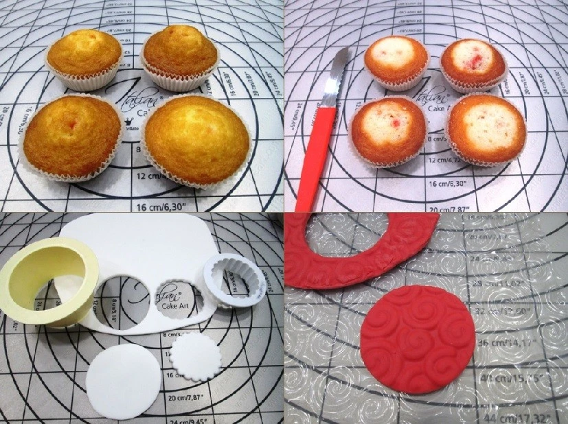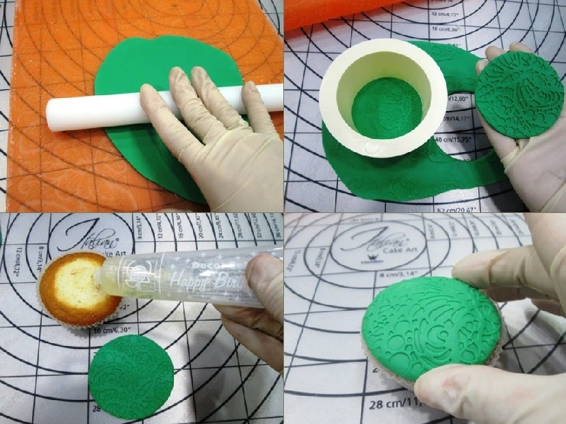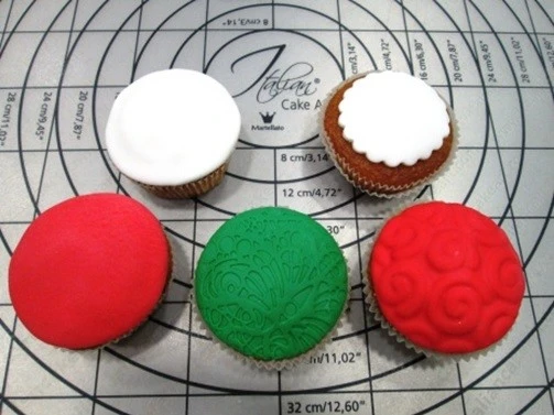 Следующим шагом будет покрытие изделий сахарной мастикой. Покрывать кексы можно как ровным слоем мастики, так и создавать разнообразные рельефы с помощью силиконовых ковриков или пластиковых трафаретов.