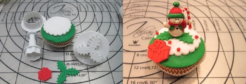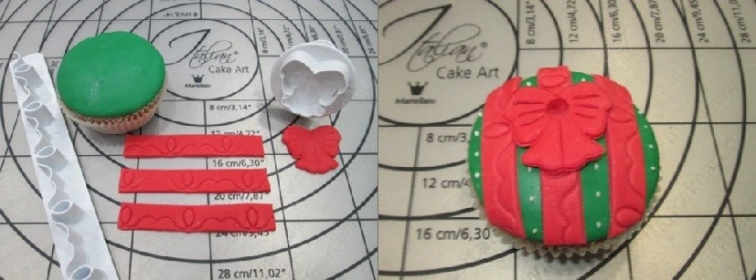 Шаг 5. Для первого кекса я буду использовать вырубку для бордюра из коллекции Italian Cake Art (артикул 40-W137). Раскатываем мастику красного цвета, нарезаем полоски шириной 1см., прикладываем вырубку, слегка надавливаем и получаем ровный красивый оттиск. Из этой же мастики вырезаем бантик с помощью специальной вырубки (артикул 40-W158). Полоски укладываем на кекс параллельно друг другу и по центру прикрепляем бантик. Чтобы декор лучше держался, можно слегка смочить поверхность водой. Как последний штрих, с помощью кондитерского мешка и насадки с тонким носиком наносим маленькие белые точки айсинга на зелёную поверхность.