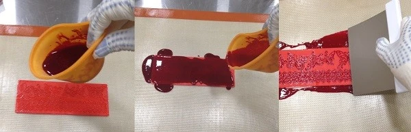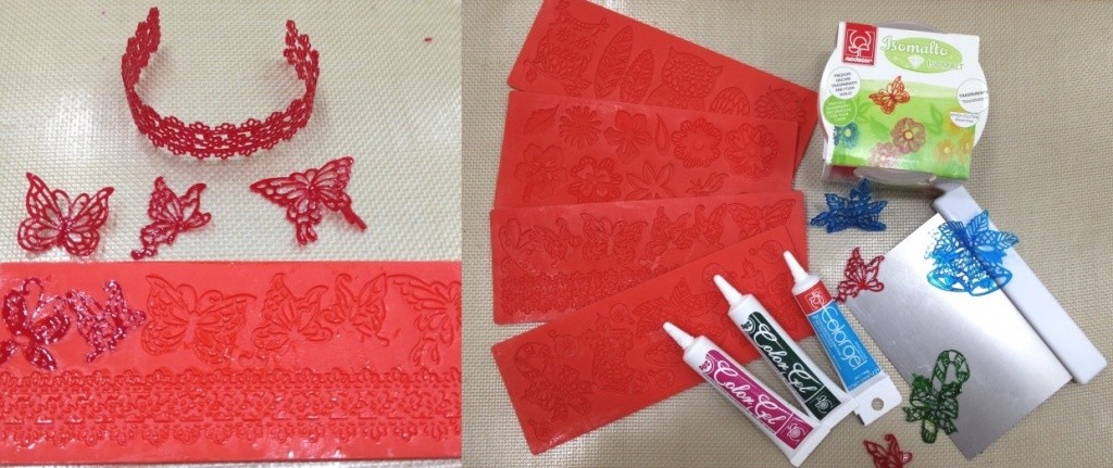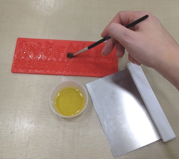 Используем специальные силиконовые коврики для создания тончайшего кружевного декора (арт. 31225, 30718). Работаем на силиконовом коврике (арт. SILICOPAT), чтобы наша горячая масса не приклеилась к поверхности стола. Коврик, а также металлический скребок смазываем растительным маслом, чтобы избежать прилипания.