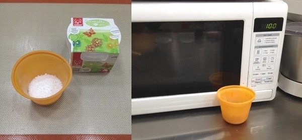 1. В микроволновой печи. Высыпаем сухой порошок в термостабильную силиконовую форму и помещаем в микроволновую печь. Постепенно помешивая, доводим до жидкого состояния.