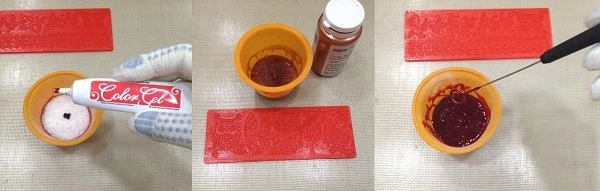 Чтобы наш декор приобрёл цвет, берем гелевые красители (арт. 24181/р) и добавляем в сухой изомальт или уже растопленный изомальт. Хотите больше блеска? Тогда добавьте небольшое количество сухого перламутрового красителя (арт. 24405) на кончике ножа.