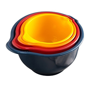 Удобные миски для взбивания ручным миксером. Благодаря своей форме предотвращают разбрызгивание продуктов при взбивании и смешивании. В набор входят 4 миски разных цветов и объемов: 1.4л, 1.9л, 2.6л, 3.6л. Имеют внутреннюю мерную шкалу. Благодаря эргономичной ручке миски удобно держать в руке.