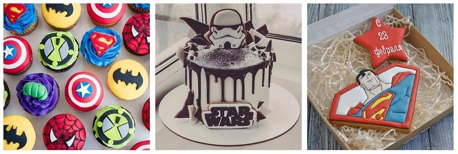 Выберете кулинарный подарок с героической тематикой, например, торт с любимыми персонажами «Звездных войн». Возможно, ваш мужчина фанат Тони Старка или Человека-Паука и оценит капкейки с марвеловской тематикой. Или он пересмотрел все фильмы с Брюсом Ли и Жан-Клод Ван Даммом, тогда лучшим подарком для него станет торт с силуэтом киногероя из мастики или сахарная пластина с напечатанным изображением.