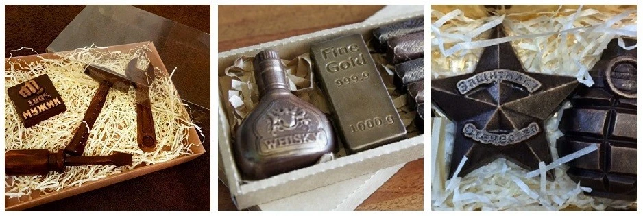 Магия шоколада заключается в том, что он всегда найдет место в сердцах и на праздничном столе. Особенно, если это качественный бельгийский шоколад Callebaut. Это пластичное сокровище может принять форму чего угодно. Для мужского праздника вы можете превратить его в сладкую копию взрывной гранаты, самолета, армейских звезд, бутылки крепкого алкоголя, оружия и других мужских вещиц. Десертные имитации оружия можно сфотографировать и съесть, а с оригиналами в жизни лучше не встречаться.